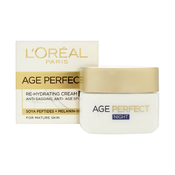 L’Oreal Age Perfect Re-Hydrating Night Cream 50ml is an anti-sagging, anti-age spots, rehydrating night cream specially formulated for mature skin. Enriched with soya peptides, Melanin-Block and a UV filter, it hydrates and improves the appearance of skin at night.